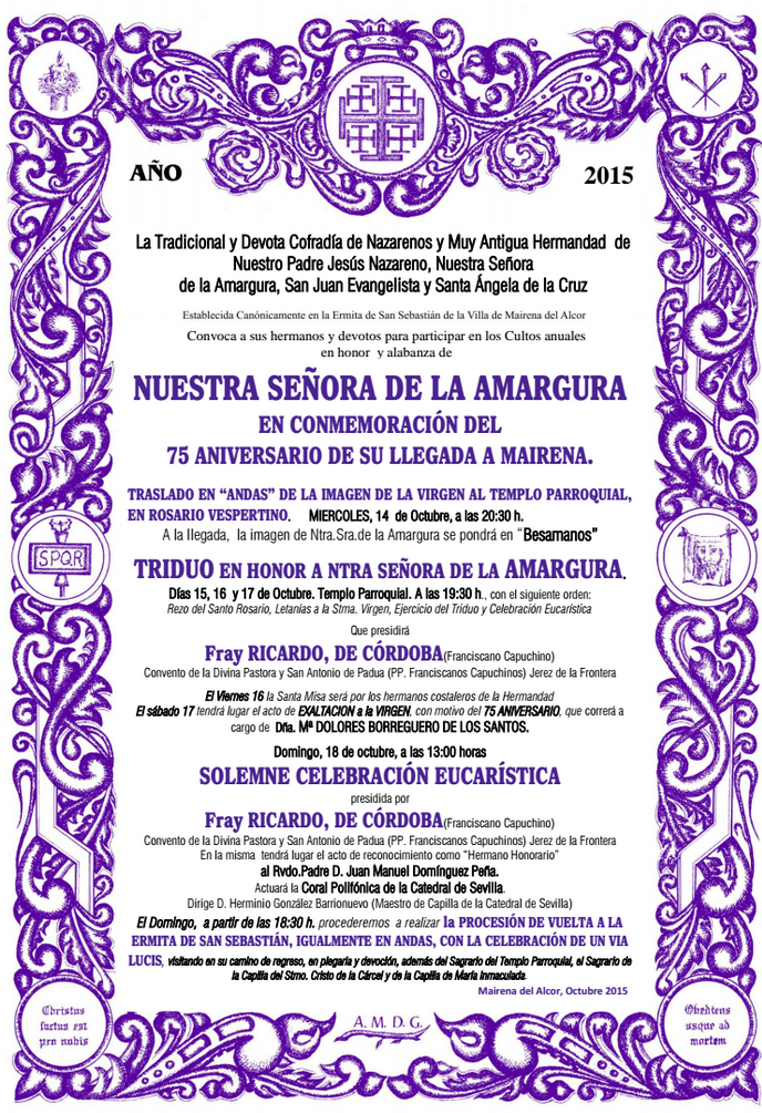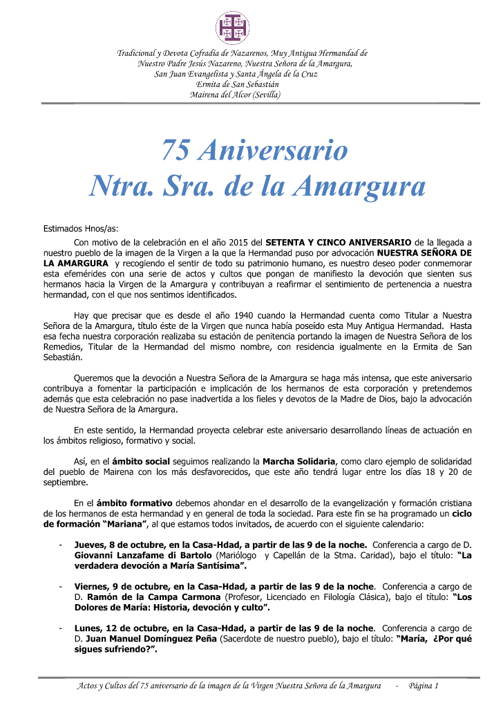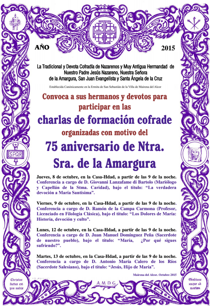 Días 15, 16 y 17 de Octubre. Templo Parroquial. A las 19:30 h.