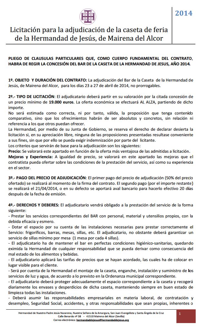 Licitación caseta de feria Hermandad de Jesús