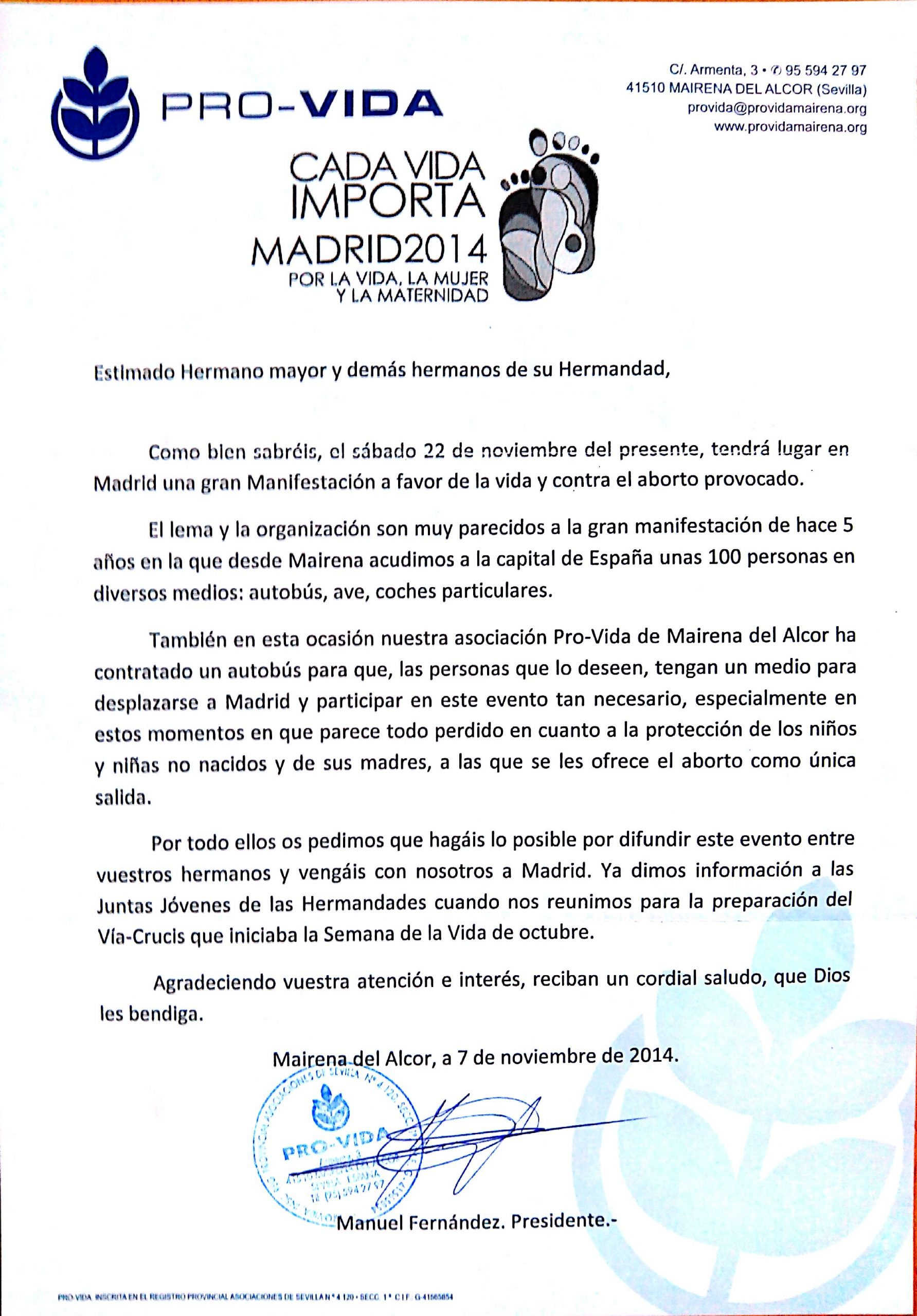 Carta de la organización Pro-Vida de Mairena a los hermanos de la Hermandad