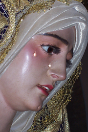 - Los ojos grandes y algo caídos, con mirada vaga y ensimismada, con tres o cuatro lágrimas cayendo por el rostro.
