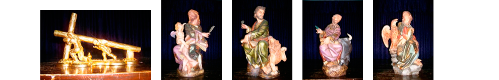 La nueva talla de los evangelistas escribanos en madera de cedro y caoba, en posición sedente de 50 cms de altura, fueron esculpidos y policromados por Ricardo Rivera.